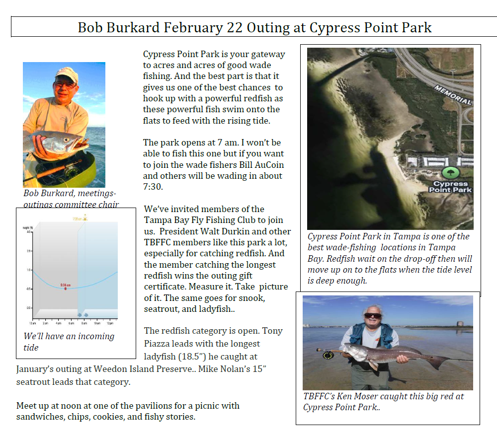 Bob Burkard: June Outing — SFF Summer Tournament This is our brand new three day summer tournament. It replaces the docklight/beaches outing. You can fly-fish freshwater and/or saltwater in Pinellas, Hillsborough, Manatee, and Polk Counties. Two-member teams: Prizes will be awarded to two-member teams catching the most different saltwater species and the most different freshwater species. You can fish from Friday evening until noon on Sunday. Take pictures of your catches and email me your team names and results on Monday after the long-weekend tournament.