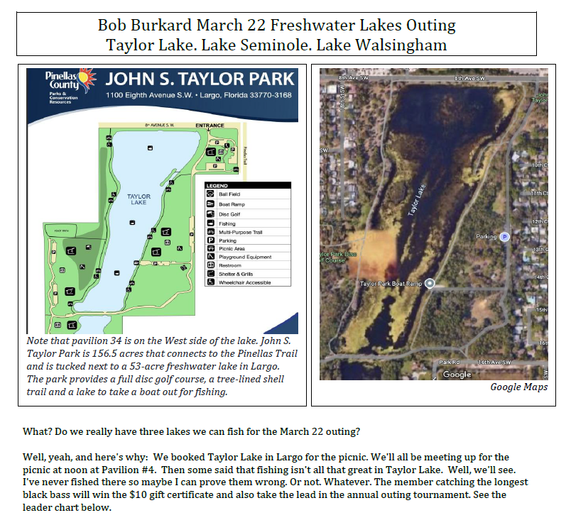December 21 Outing. Walsingham Lake in Largo. 12615 on 102nd Avenue. You can also enter at the North end on Walsingham Road.